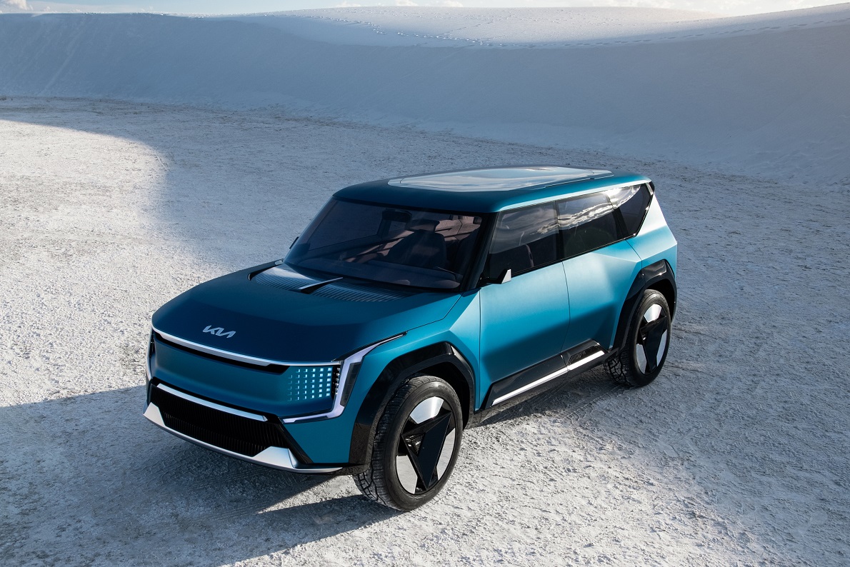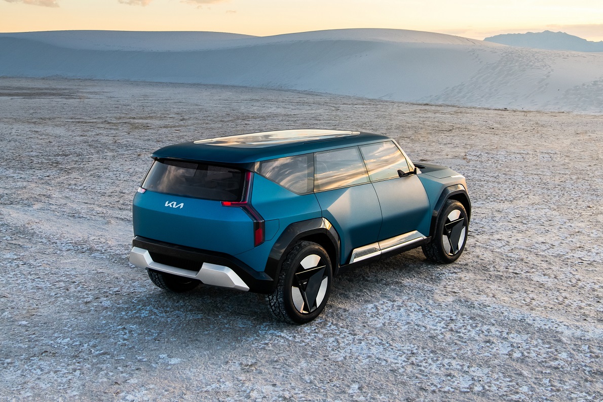El EV9 totalmente eléctrico encarna la apariencia robusta pero sofisticada propia de un SUV insignia. El lenguaje de diseño cuadrado y triangular del EV9 enfatiza la tensión de sus voladizos cortos y su larga distancia entre ejes de 122,0 pulgadas, empujados hacia las esquinas sobre los apuntalamientos eléctricos modulares E-GMP.