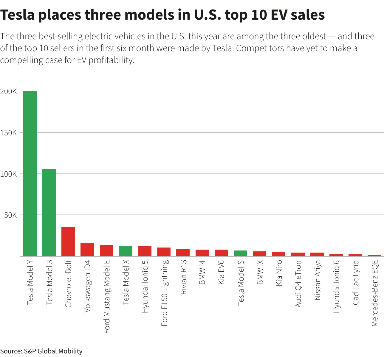 Según datos de S&P Global Mobility, marca por marca, Tesla vendió más que sus siguientes 19 competidores por 10 a uno o más durante el primer semestre.