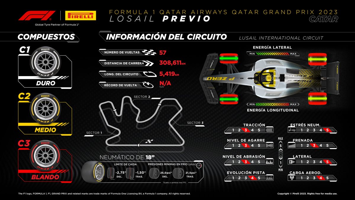 - Los equipos dispondrán en el GP de Catar del C1 como P Zero Blanco (Duro, el C2 como P Zero Amarillo (Medio) y el C3 como P Zero Rojo (Blando), la misma designación de la última carrera, disputada en Japón.