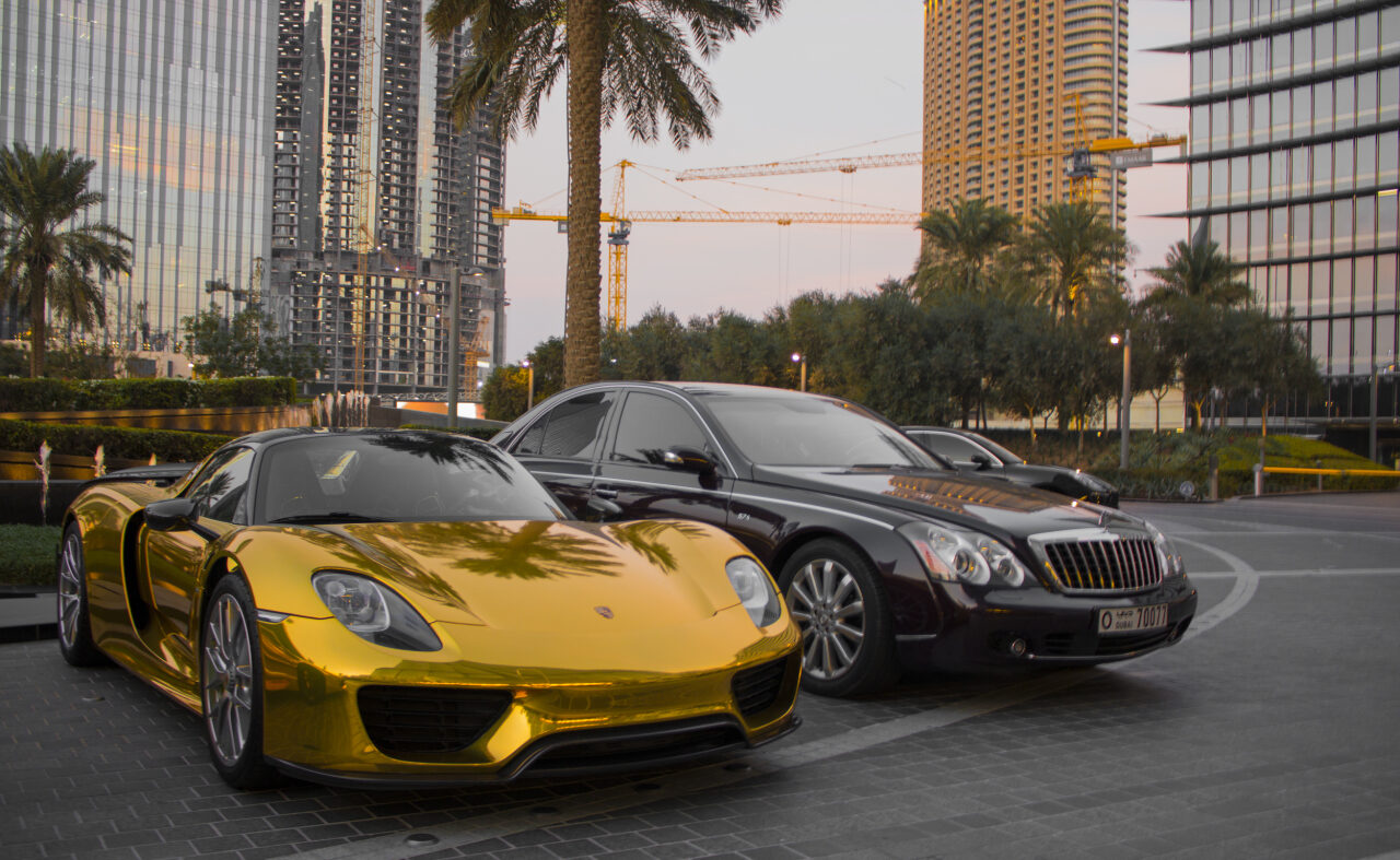 Una de las formas más obvias de ostentar la riqueza en público es pasearse por la ciudad en un auto caro. En Estados Unidos, cuando vemos pasar un Ferrari o un Lamborghini, es difícil no pararse a mirarlo. Si uno se detuviera a mirar cada vez que pasa un superauto por Dubai, sufriría un latigazo cervical en un santiamén.